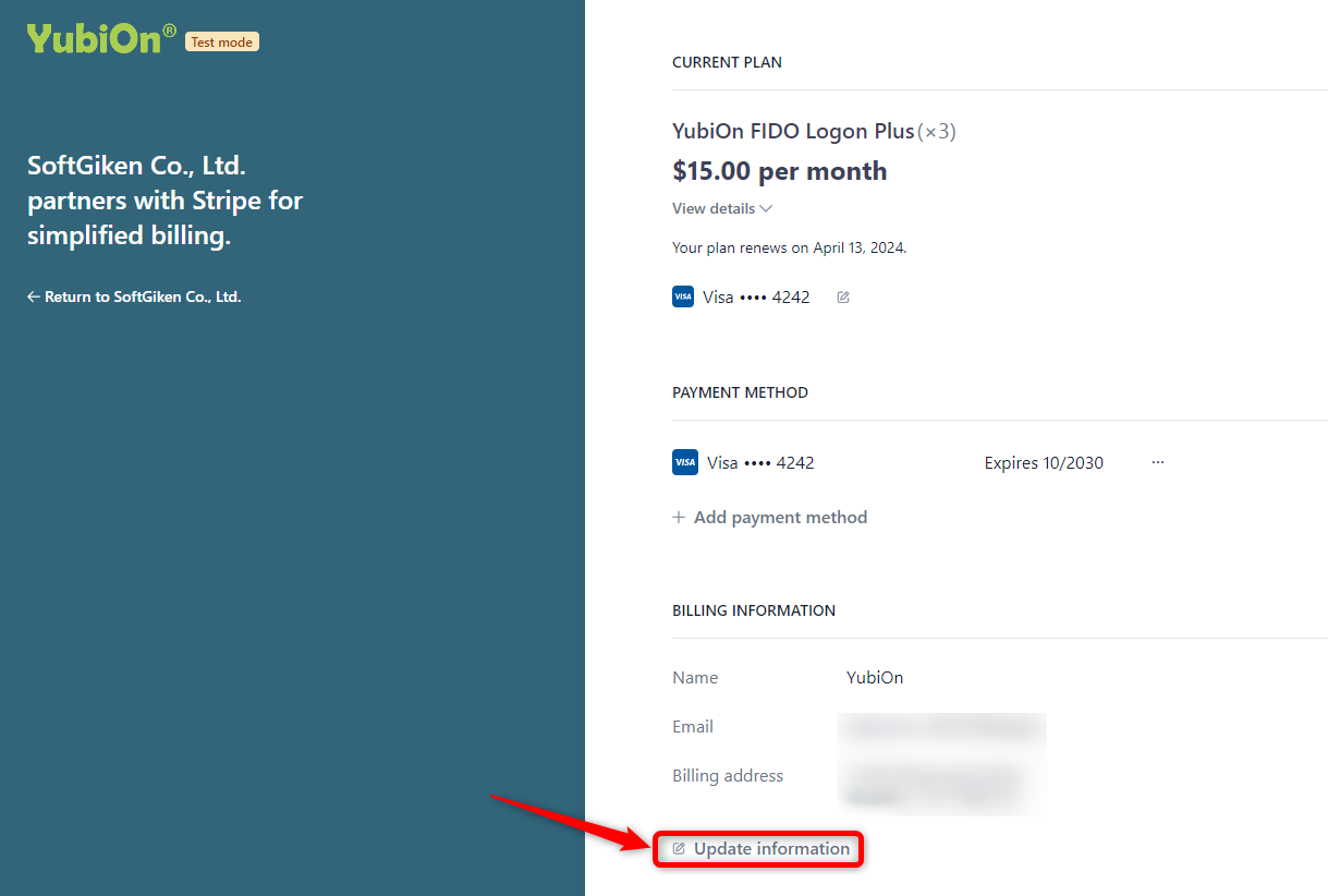 If no payment method is registered, click on “Add payment method”, Enter the new card number, expiration date, security code (CVC), and country.