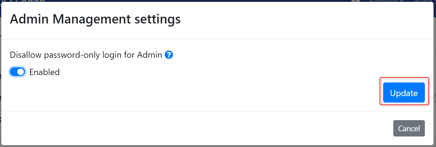 - In the “Administrator Management Settings” modal, enable or disable the “Disallow password-only login for Admin” setting.