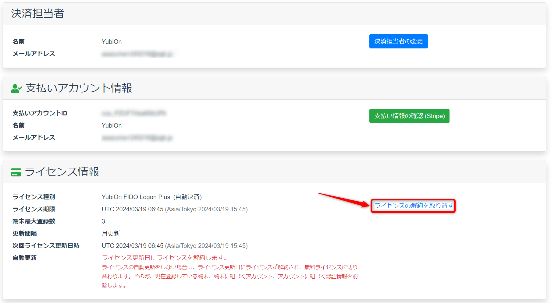 - オンライン決済のStripeアカウントに関しては、YubiOn FIDO Logonを退会する際に併せて削除します。