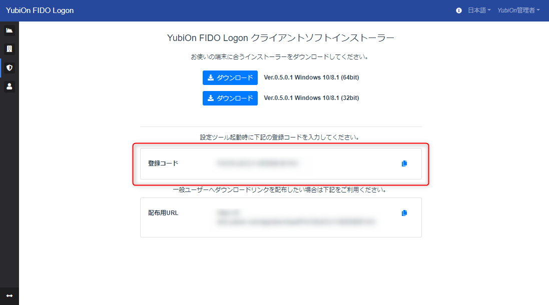 設定ツールを起動すると登録コード入力を要求します。登録コード入力時に端末PCの情報をサーバーに登録し、YubiOn FIDO Logonが利用できるようになります。