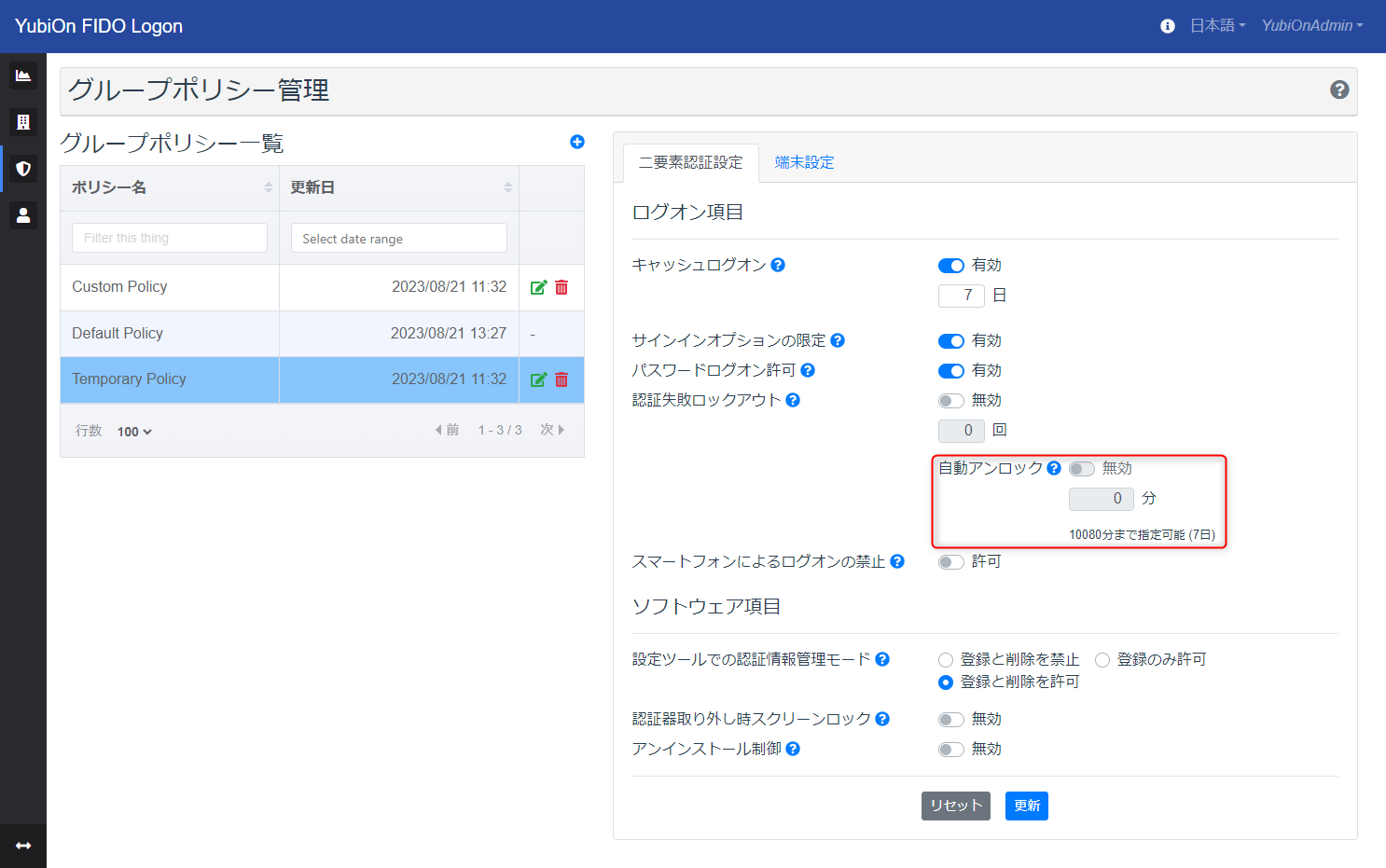 有効に設定した場合は「自動アンロック」設定を変更することができます。設定アイコンをクリックして設定を変更します。