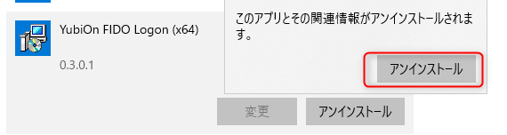 「アプリと機能」の一覧から「YubiOn FIDO Logon」探して選択し、「アンインストール」ボタンをクリックします。